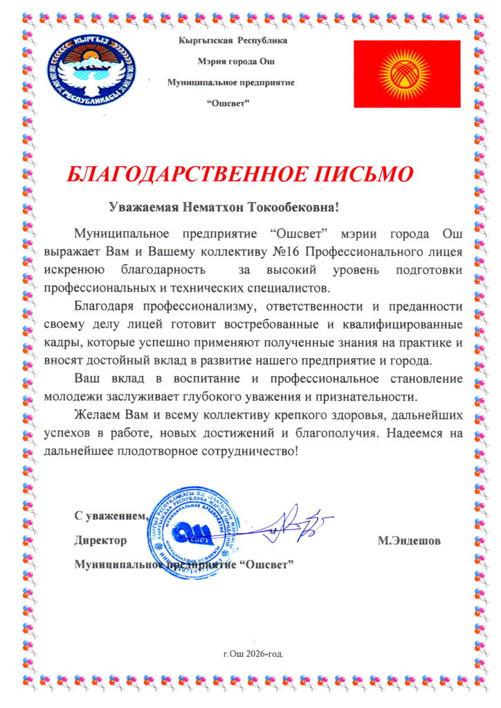 Бүгүн биздин Ош шаарындагы №16 Кесиптик лицейде да майрамдык маанай өкүм сүрүүдө. Окуучуларыбыз тарабынан даярдалган салтанаттуу иш-чара жогорку деңгээлде өтүп, патриоттук ырлар жаңырып, куттуктоо сөздөр айтылып, концерттик номерлер тартууланды. Бул майрам жаштардын мекенчилдик сезимин ойготуп, Ата Мекенди сүйүүгө жана коргоого чакырган маанилүү тарбиялык саат болду.