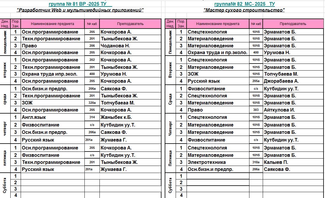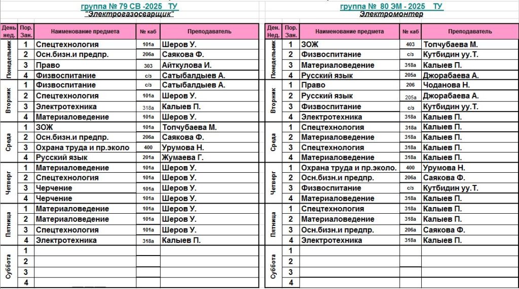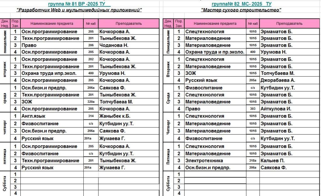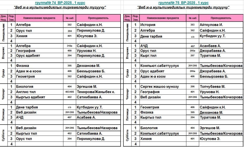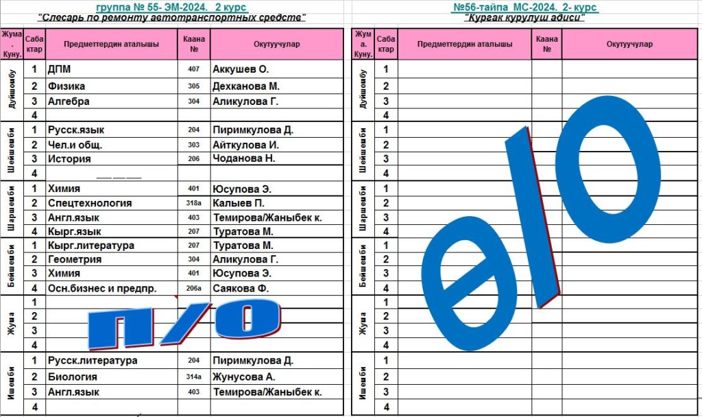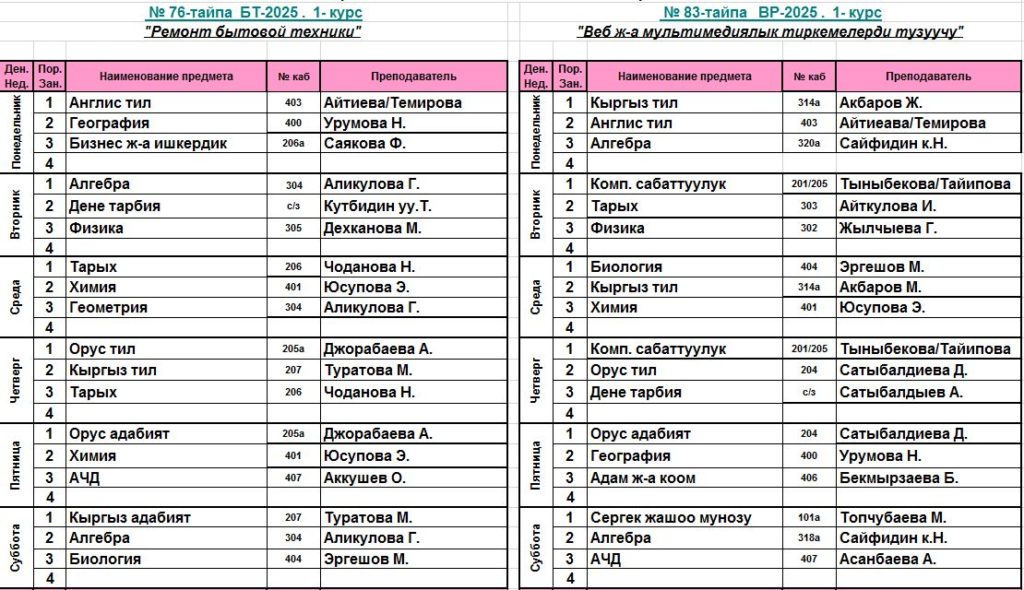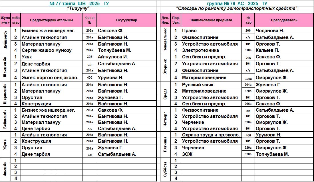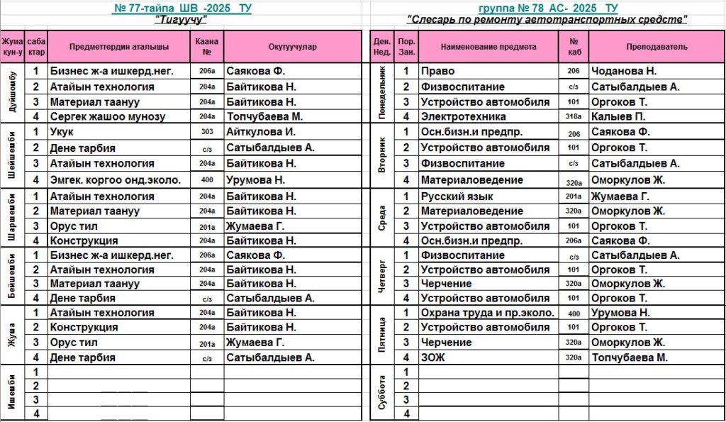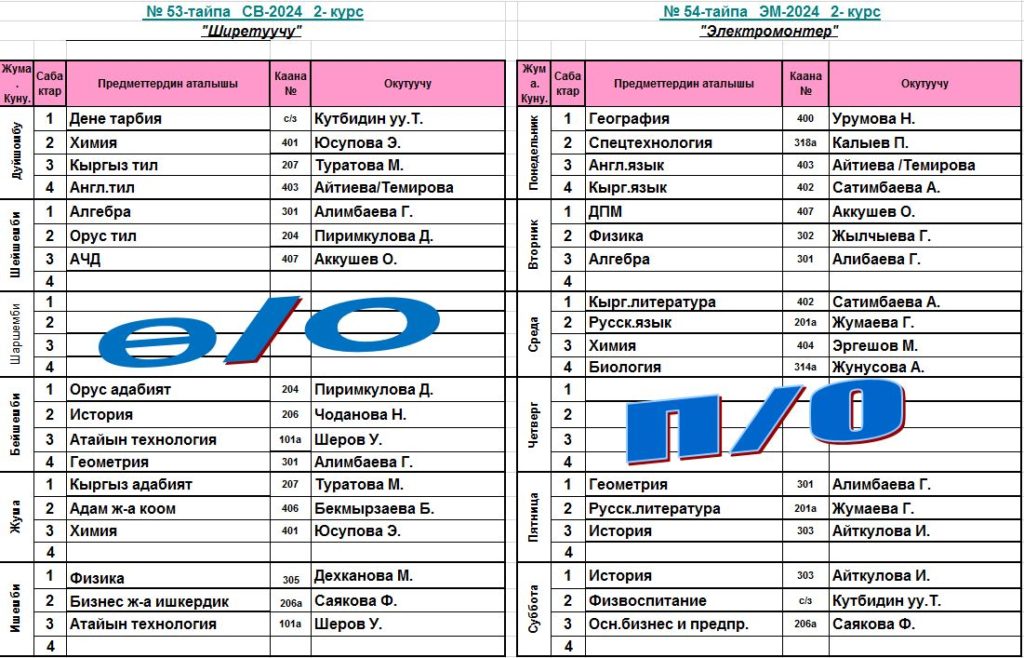 Сабактардын жадыбалы