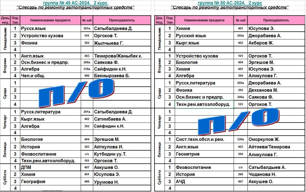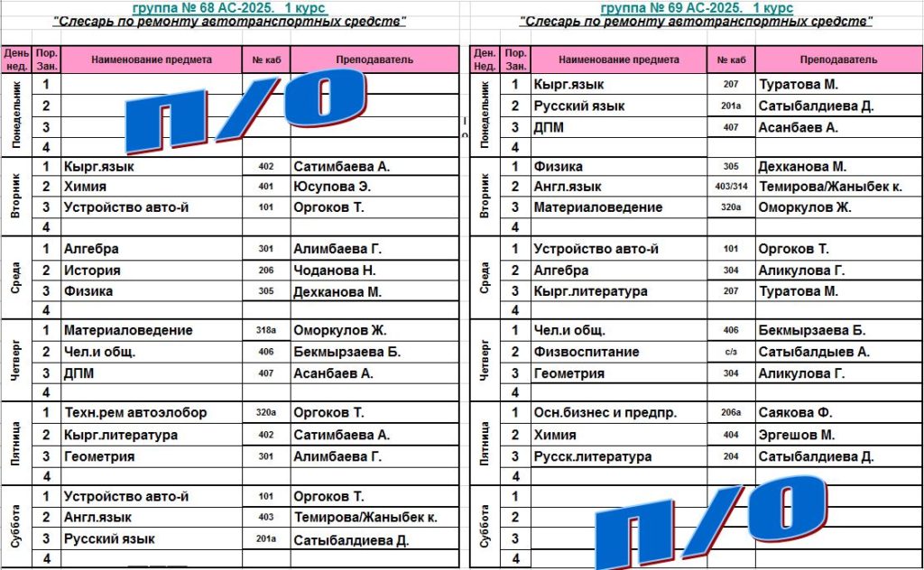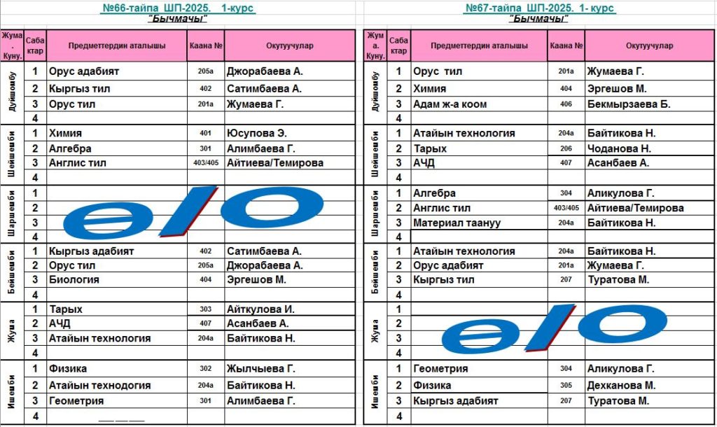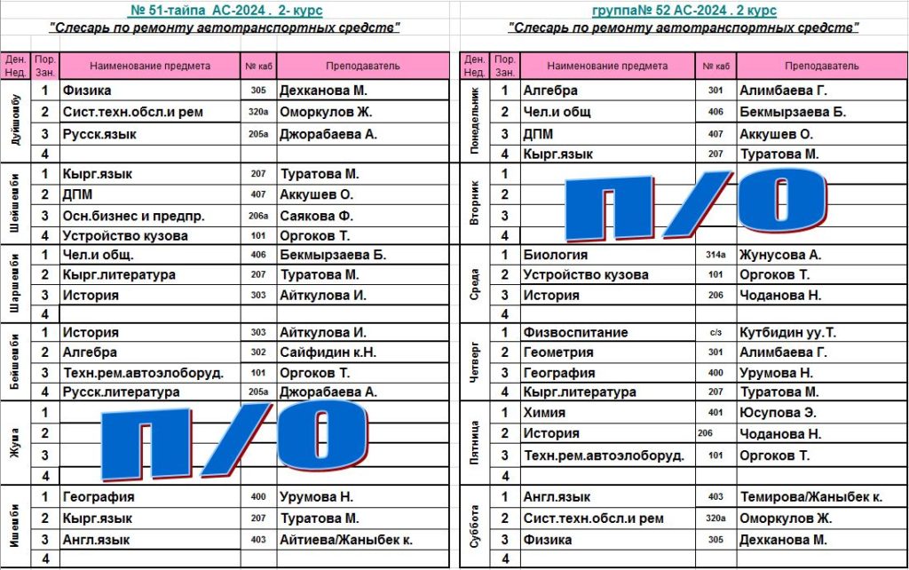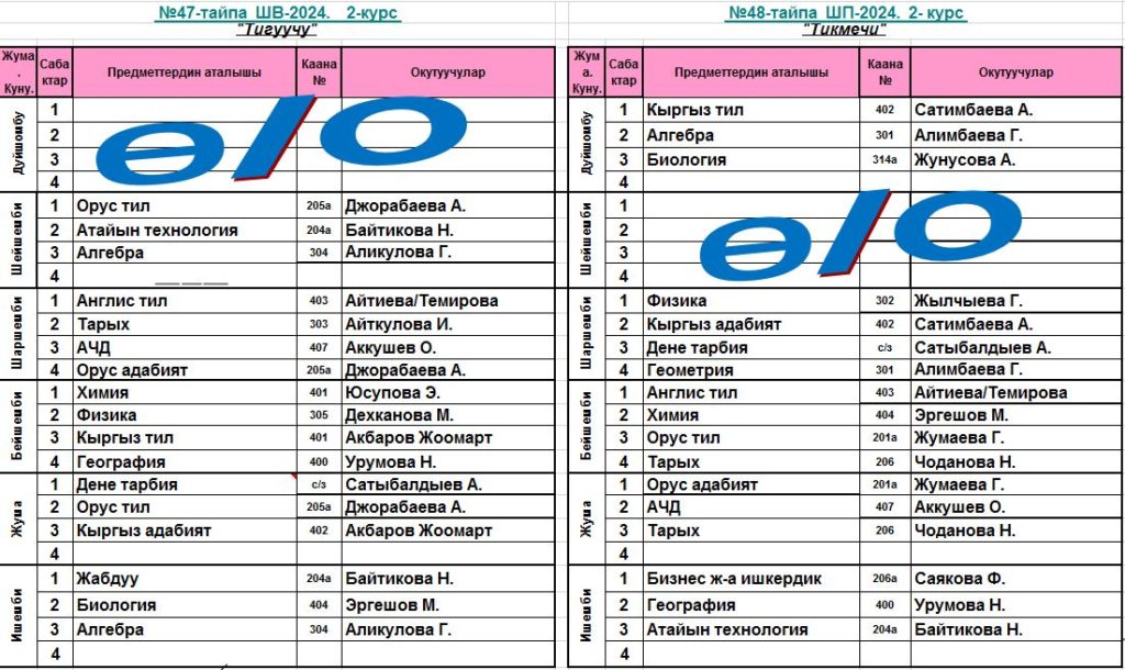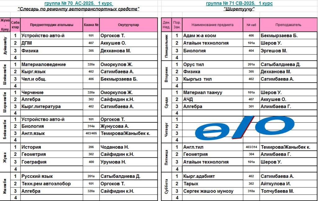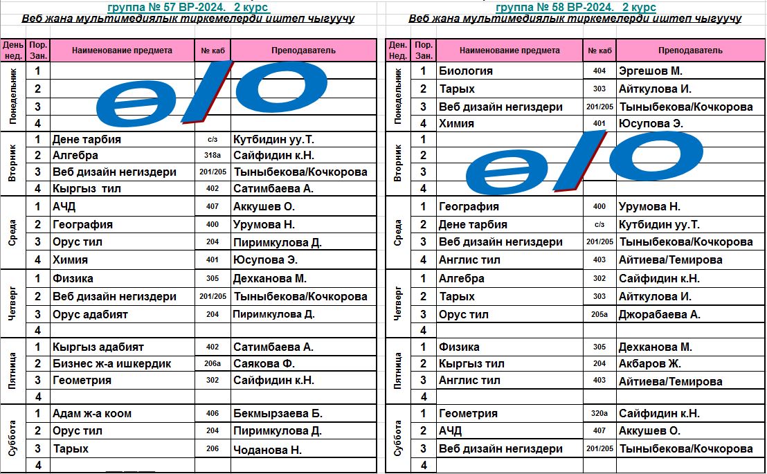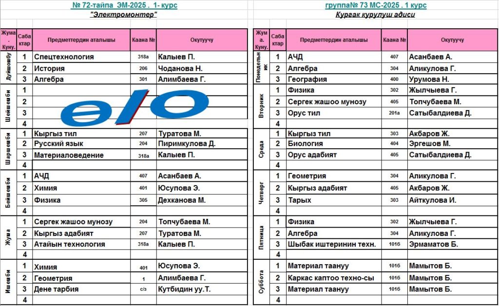 Сабактардын жадыбалы